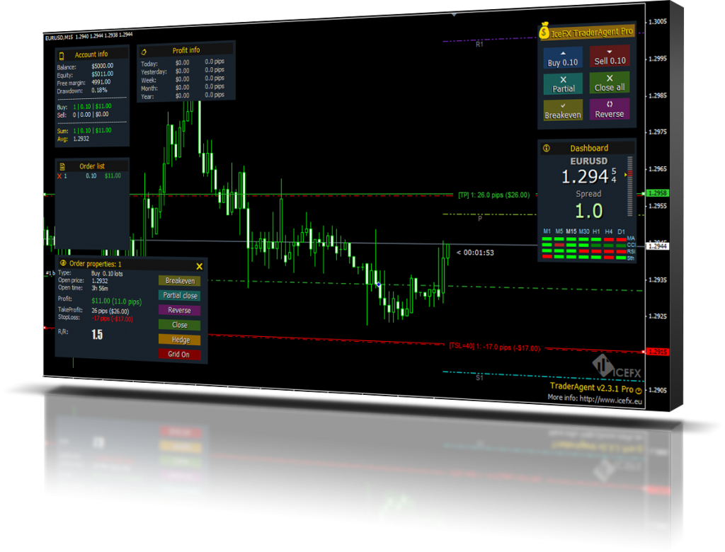 Профессиональный торговый помощник для MetaTrader 4 TraderAgent - лучший помощник трейдера форекс. Это не автоматический торговый робот (EA), и он не принимает решений и не открывает позиции, но он помогает вашей профессиональной работе, когда вы торгуете вручную. Вся важная информация отображается на графике, поэтому вам нужно всего лишь открыть позицию одним щелчком мыши. Управлять открытой позицией так же просто: с помощью мыши или указывающего устройства вы можете легко настроить уровни стоп-лосса и тейк-профита с помощью метода перетаскивания. После этого TraderAgent будет работать для вас как решение для управления позициями.